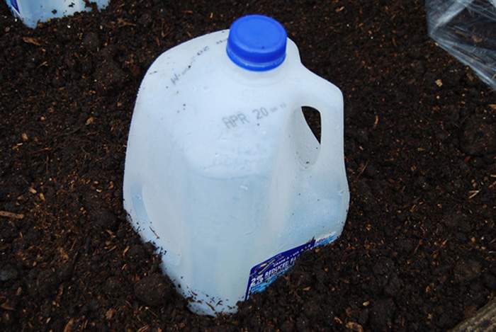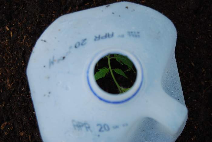 Just place the prepared jug over the plants and then push some soil up around the container to help hold it in place. I actually placed my tomato cages around the jugs to help keep them from blowing over. But most of the time just building up the soil is good enough.