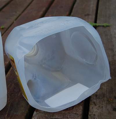 I just cut the bottom of the jug off. Be careful as you are cutting the bottoms off. I didn’t get my plastic jugs quite rinsed out well enough and some of the old milk remained in a few of my plastic containers and the smell was awful. Just awful.