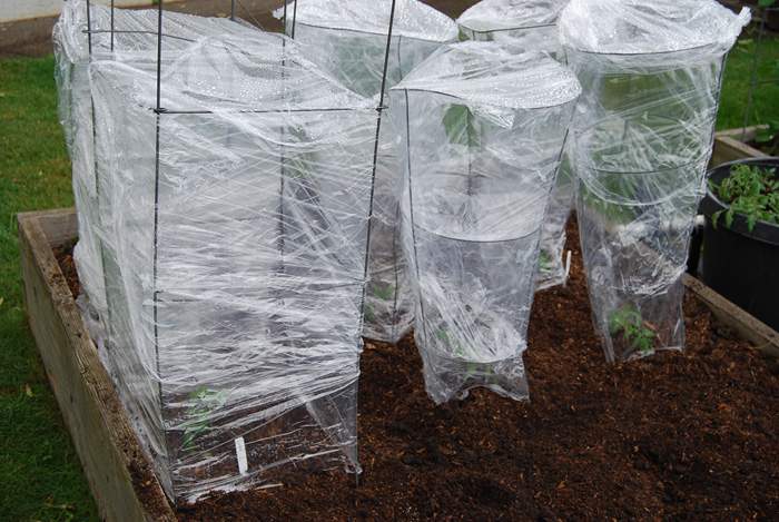 This is my first year trying to wrap my tomato cages with plastic to protect them and they have doubled in size in the last two weeks even though we had less than ideal weather. (With temps in the 40’s and 4 inches of rain in the last two week.) My plastic jug covered tomatoes did the same. I had to uncover them today as they had outgrown the jugs.